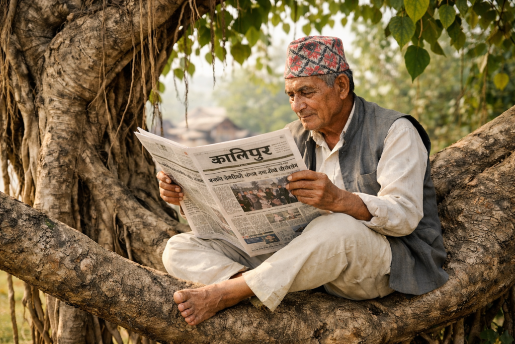 पिपलको बोटमा बसेर समाचार पल्टाउँदाकागजमा देश देखिन्छ,मनमा पीडा।शीर्षकहरू ठूला छन्,जनताको जीवन सानो।नेताका भाषण मोटा,किसानको सपना पातलो हिजोको आशा आज पनिमसी सुक्न नपाउँदै फेरिन्छ,तर पिपल उभिएको छसाक्षी बनेर शान्त, मौन, अडिग यो देशसमाचारमा होइन,यिनै बोट, माटोर चुपचाप सहँदै बसेकामानिसको आँखामा बस्छ।